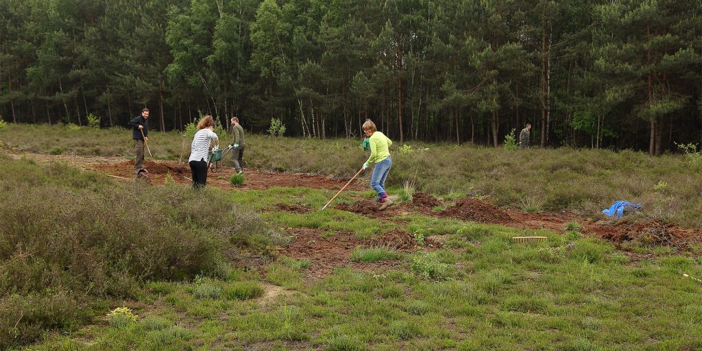 Een proefstukje laat zien dat als het mos wordt afgeplagd tot op de (arme) zandlaag, de oorspronkelijke heide terugkeert.