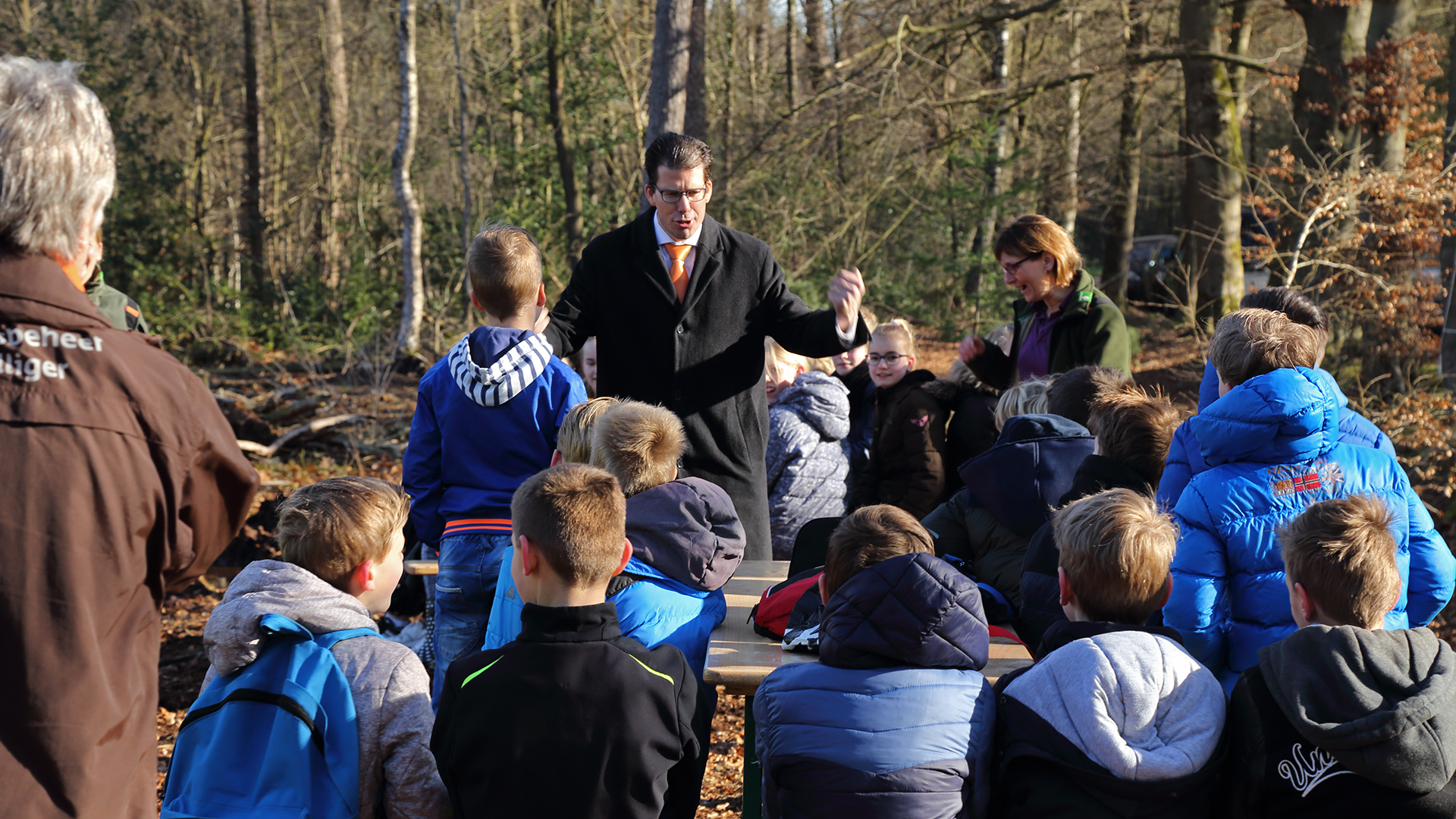 De klas begint met een biologieles van de burgemeester over het nut van onze bossen. Of vertelden de leerlingen nu juist het hoe en waarom? Het enthousiasme zit er bij deze groep kinderen in ieder geval van meet af aan goed in.