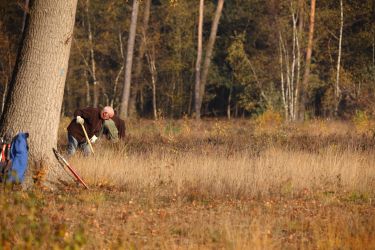 Vooral de vele berken vormen een uitdaging. Deze wortelen te goed om er simpelweg uitgetrokken te worden. Deze hebben we zoveel mogelijk met spade losgestoken, en waar deze al te groot waren zo laag mogelijk afgezaagd. De jongste vrijwilliger bewees hier zeer bedreven in te zijn. En passant kon hij zo ook alvast een leuk kerstboompje scoren 😉